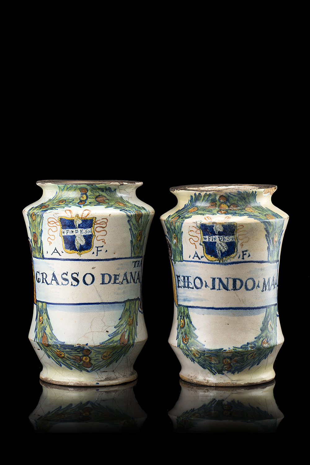 Manifattura di Faenza, secolo XVI. Coppia di albarelli in maiolica "a rocchetto" decorata in policroma su fondo bianco da ghirlanda di foglie e frutti, cartiglio con scritta farmaceutica sormontato da stemma entro cifre A.F. (h. cm 17,5 ca.) (difetti e restauri)