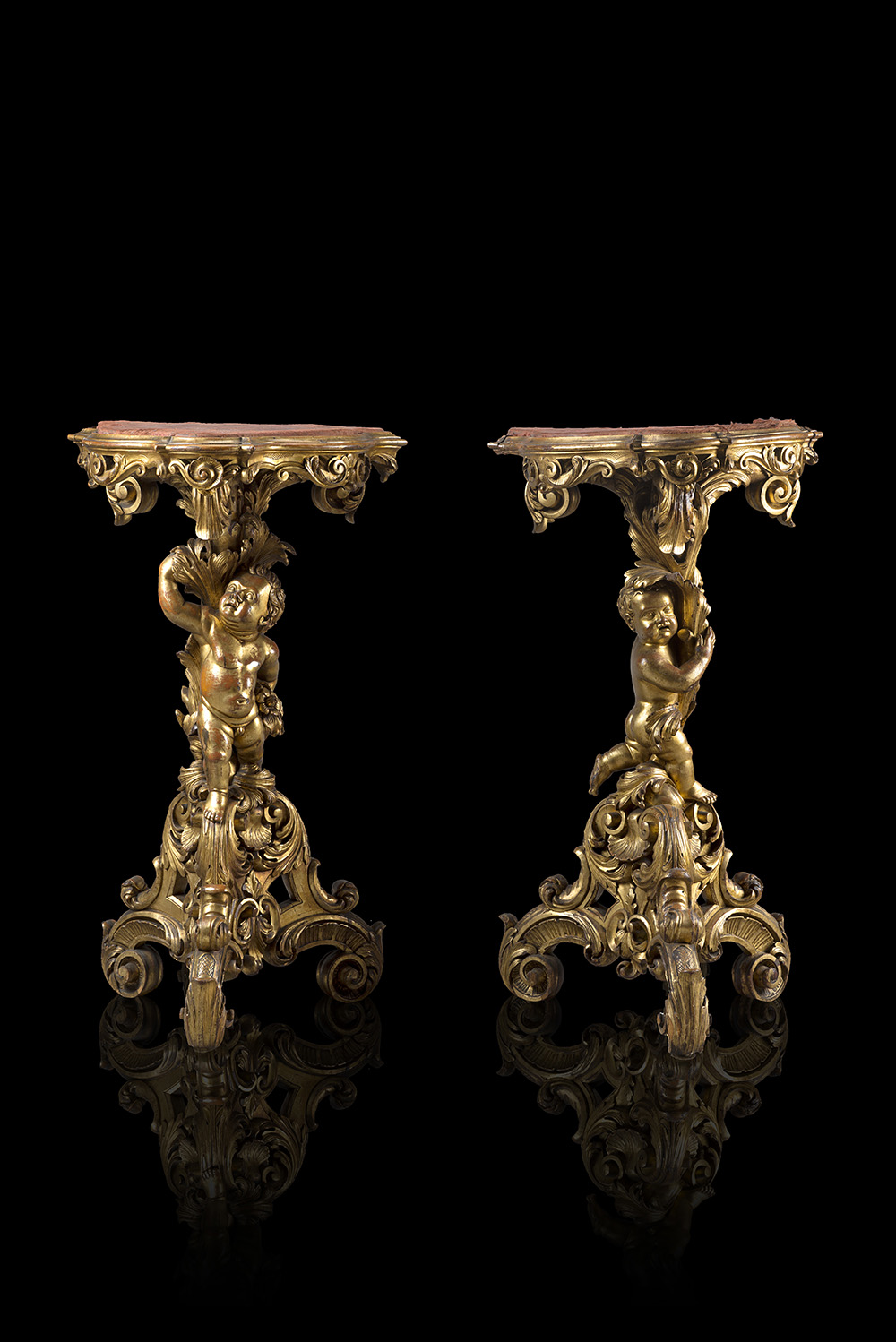 Coppia di gueridon in legno intagliato e dorato con piano sagomato sorretto da putto a tutto tondo e motivi fogliati. Secolo XIX (h. cm 107 x 60) (difetti)