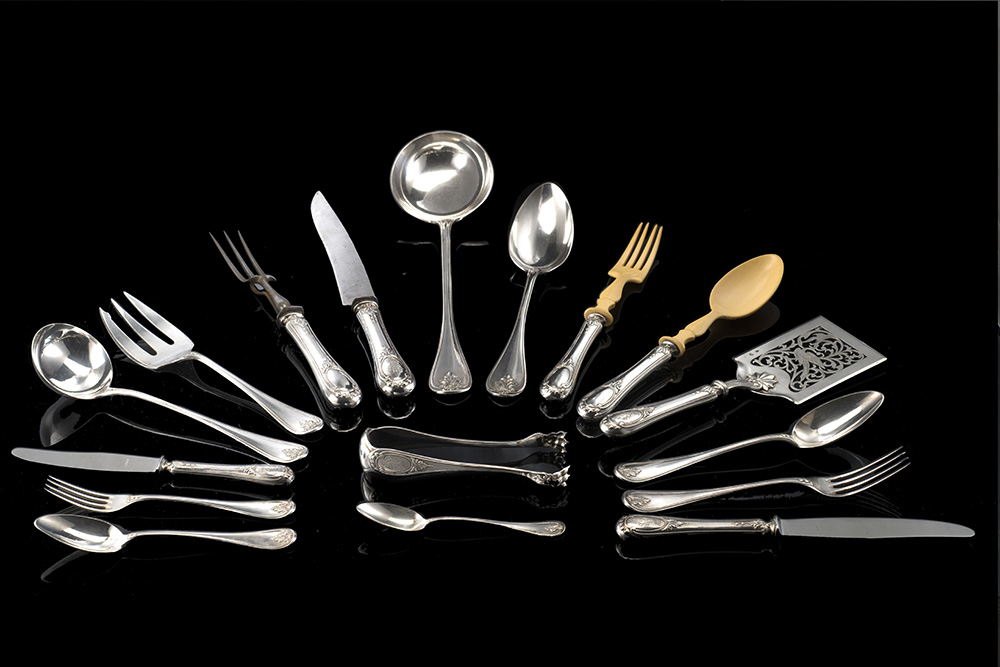 Servizio di posate in argento con prese decorate a volute e campanule composto da dodici forchette, dodici coltelli e dodici cucchiai da pasto, dodici forchette, dodici coltelli e dodici cucchiai da frutta, dodici forchette da dolce, ventiquattro cucchiaini, dieci posate da portata. Cifrato "CG" coronato. Francia, inizio secolo XX (g 5400 ca.) (un cucchiaio di differente manifattura)