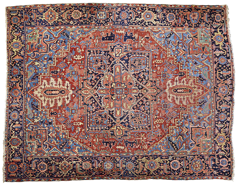 Disegno a medaglione nei toni del blu, rosso e giallo su fondo rosso. Angolari azzurri e bordura Herati su fondo blu notte (cm 425x340) (difetti)
