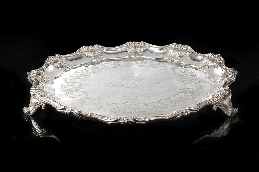 Salver in argento con bordo sagomato decorato a motivi vegetali. Cavetto inciso con dedica e data Agosto 1840. Piedi a ricciolo. Punzoni di Londra, 1839 (d. cm 41) (g 2800 ca.)