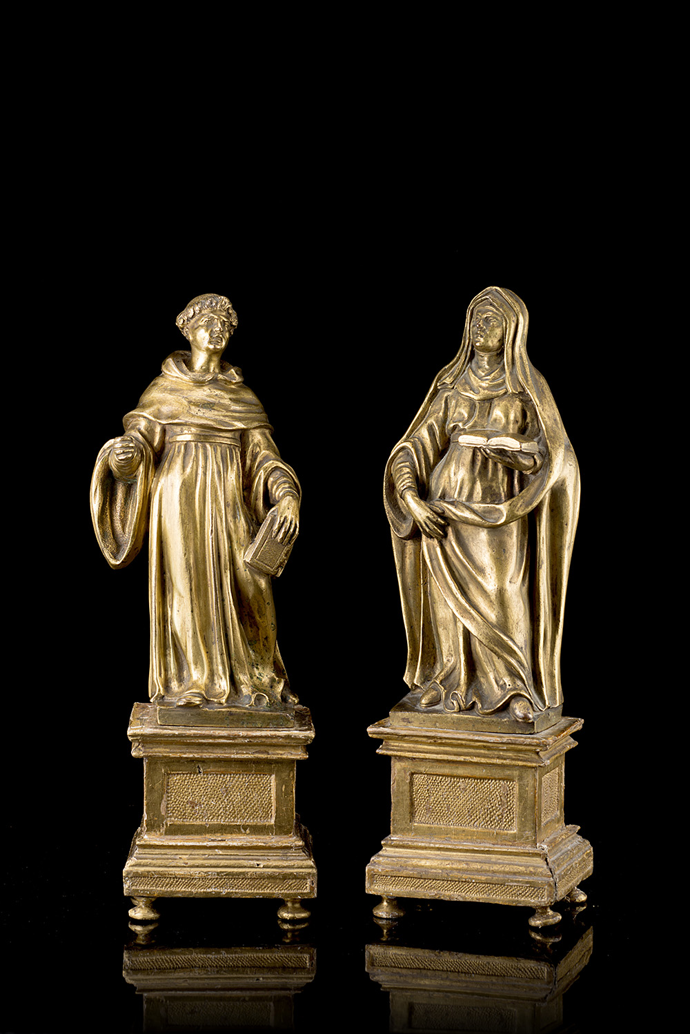 Artista del secolo XVII "Santi" coppia di sculture in bronzo dorato (h. cm 22) Poggianti su basi a plinto in legno dorato e bulinato (mancanze)