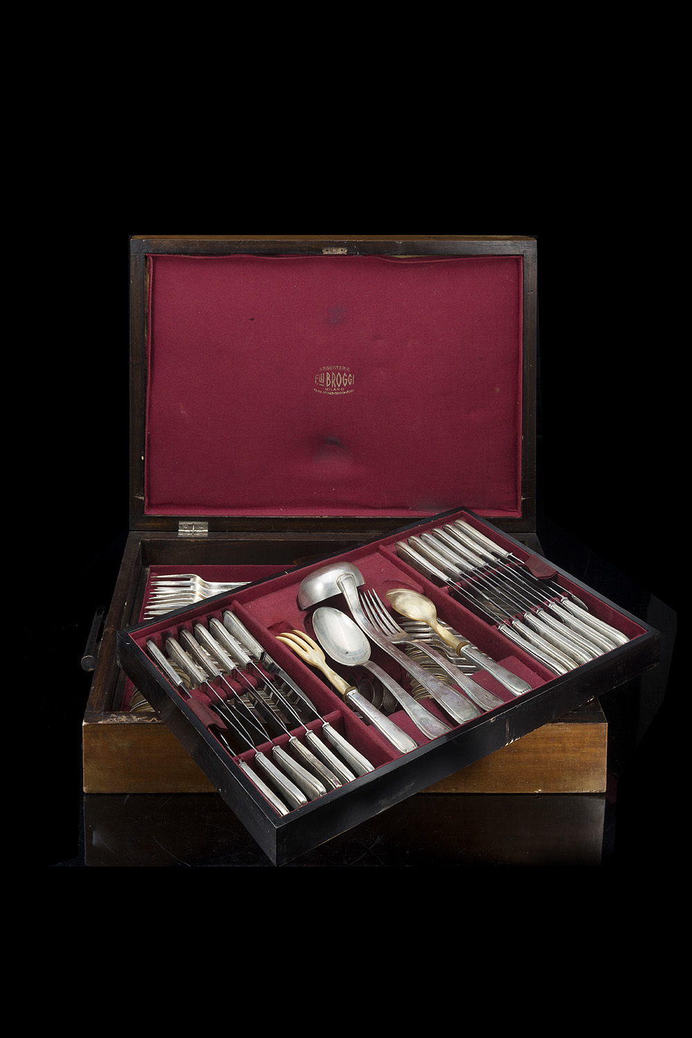 Servizio di posate in argento a corpo liscio con disegno anni trenta comopsto da dodici forchette, dodici coltelli e dodici cucchiai da pasto, dodici forchette, dodici coltelli e dodici cucchiai da frutta, dodici cucchiaini e cinque posate da portata. Punzoni del Fascio, Titolo 800. Argentiere Fratelli Broggi, Milano. In custodia coeva con profili e anse in legno ebanizzato (g tot 4690 ca.) (lievi difetti)