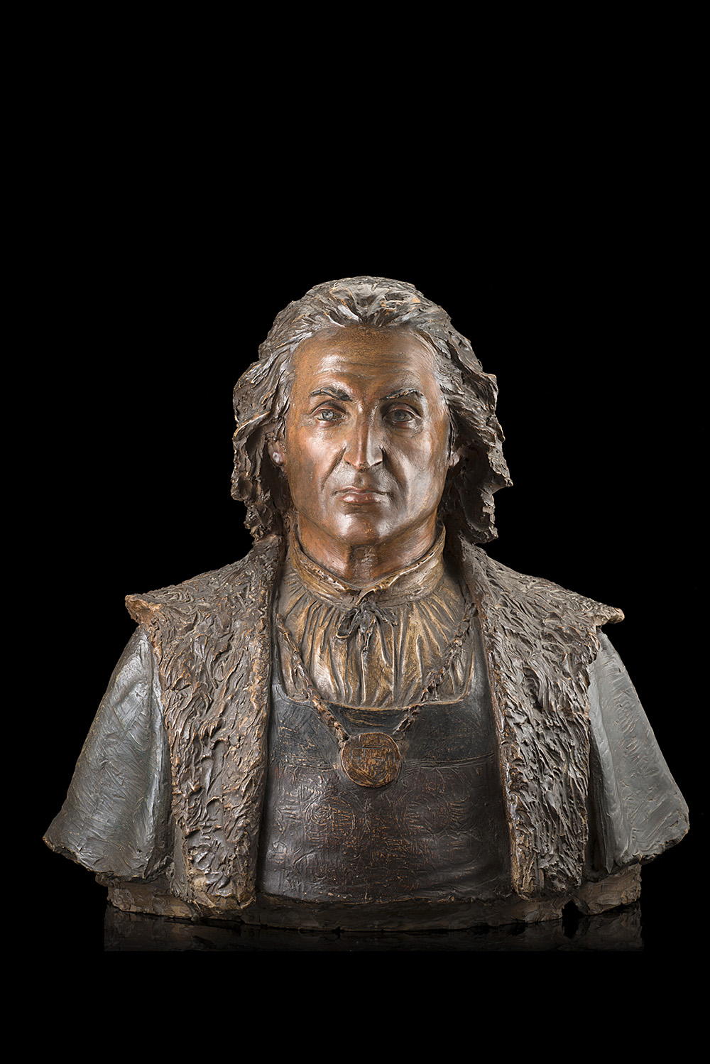 Antico busto in terracotta policroma raffigurante un navigatore decorato con medaglione (h. cm 57) (difetti e restauri)