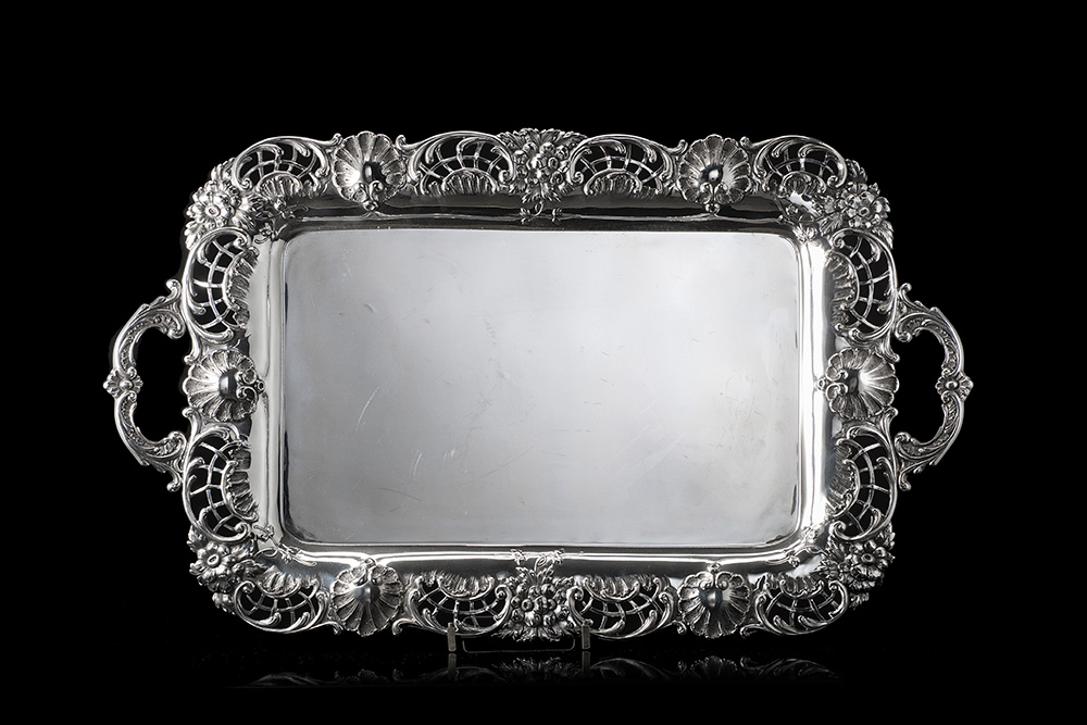 Vassoio biansato in argento con bordura sbalzata e traforata a motivi fogliati, fiori e conchiglie. Portogallo, seconda metà del secolo XIX (cm 70 ca.) (g 2440 ca.) (lievi difetti)