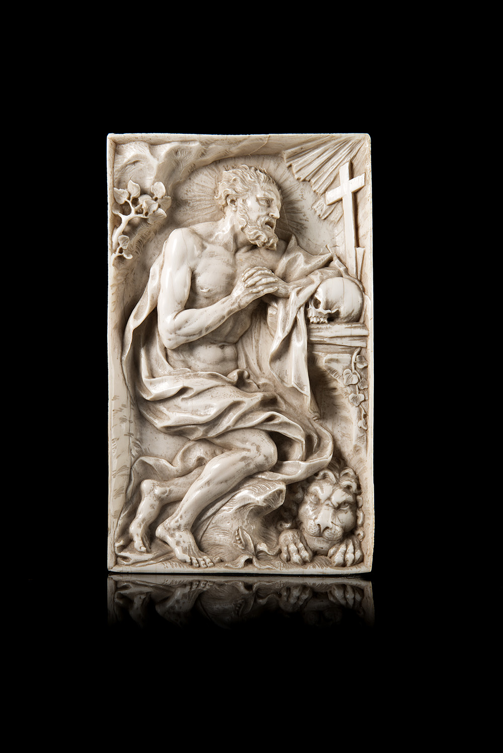 Arte nord-europea, secolo XVII "San Girolamo penitente" bassorilievo in avorio (cm 20,5x12,5) (restauri)