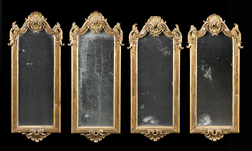 Gruppo di quattro antiche specchiere in legno intagliato e dorato con cimasa centrata da conchiglia tra girali di foglie (h. cm 65) (restauri)