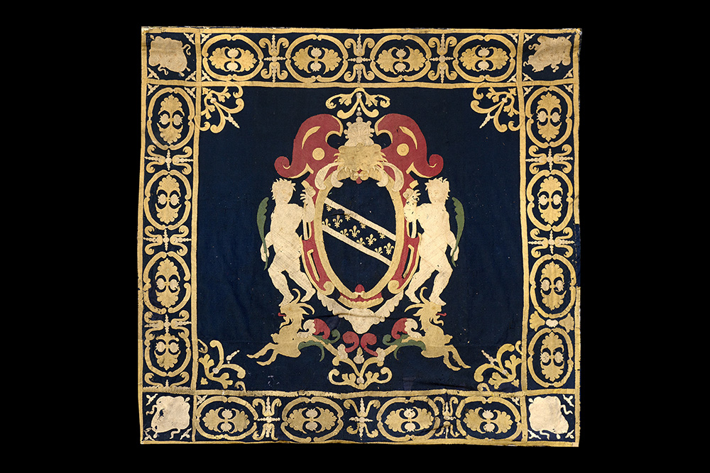 A wool cloth patchwork tapestry depicting a noble coat of arms. Italy, 17th/19th century (231x227 cm) (defects and losses)