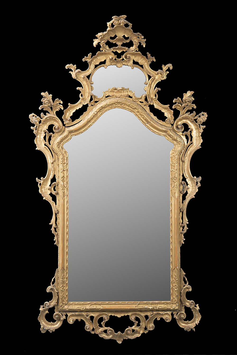 Specchiera di forma sagomata in legno intagliato e dorato, fregi traforati a riccioli, volute ed elementi vegetali, cimasa con specchio. Secolo XVIII (h. cm 180) (lievi mancanze e restauri, doratura di epoca posteriore)