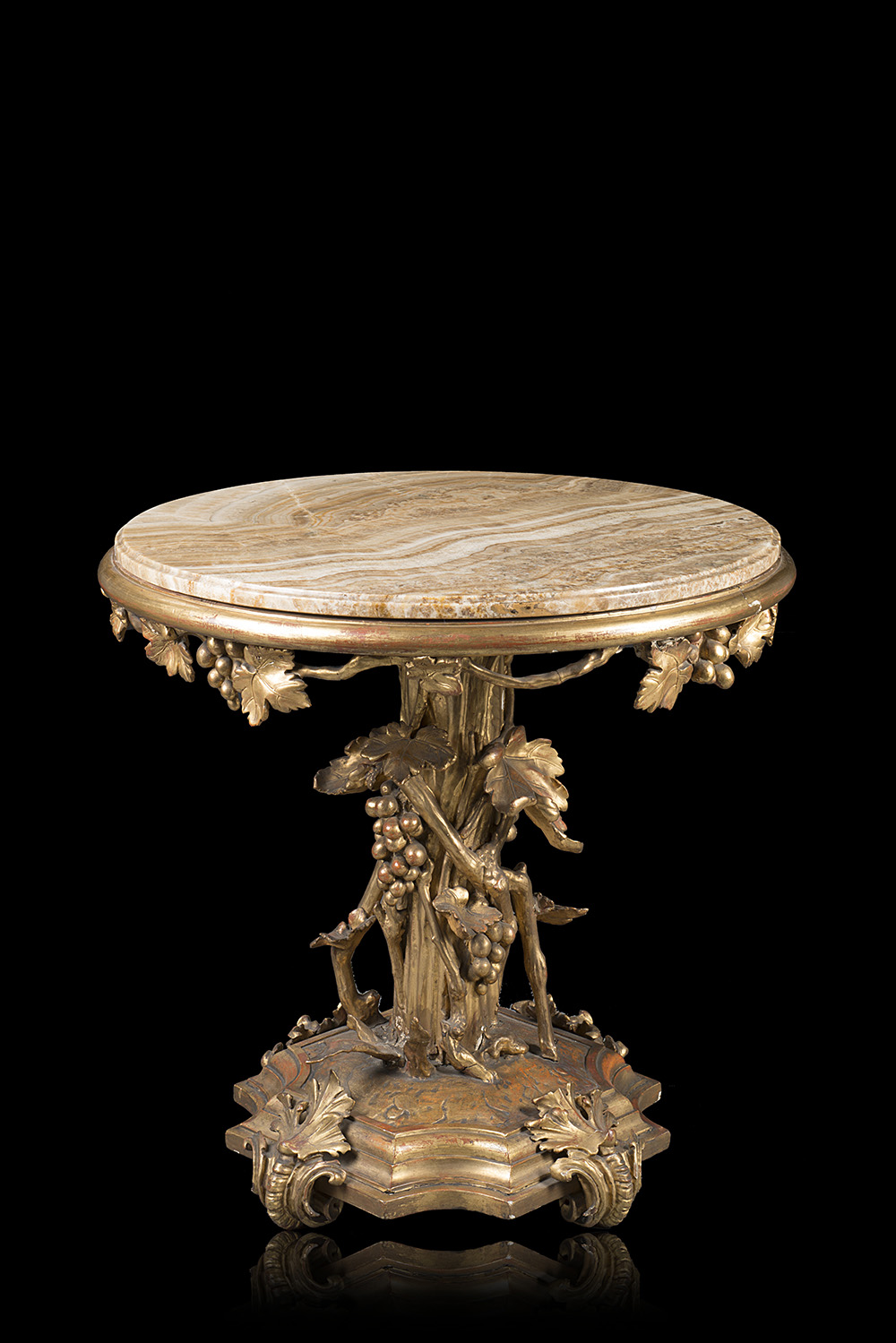 Tavolo da centro in legno intagliato e dorato con gamba centrale scolpita a tronco e tralci di vite. Base sagomata e piedi fogliati. Piano in alabastro africano. Secolo XIX (d. cm 75 x h. cm 73) (difetti)