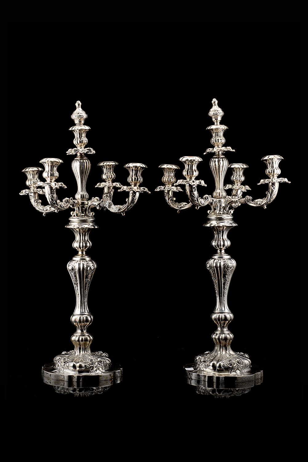 A pair of silver five-flamed candelabras. Austrian hallmarks, 19th Century (defects and restoration)