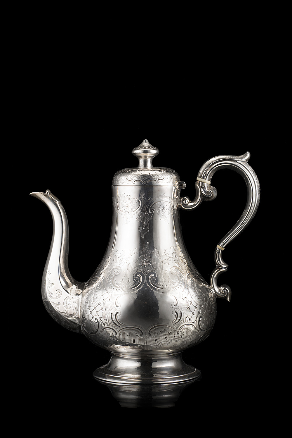 Teiera in argento con decori floreali e volute incise, ansa mossa. Marchi città di Sheffield, 1857 (h. cm 25) (g 770 ca.) (difetti)