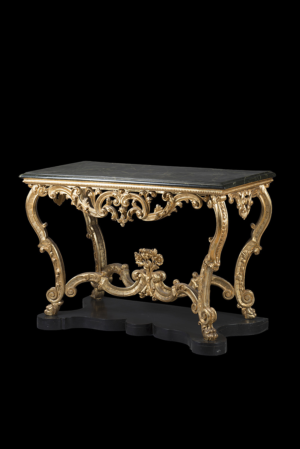 Tavolo da parete in legno intagliato e dorato a mecca con grembiale traforato, gambe mosse decorate a volute e riccioli riunite da traverse centrate da mazzo fiorito. Piedi ferini e basamento sagomato e laccato. Piano in legno laccato a finto marmo. Secolo XIX (cm 143x102x73) (difetti)