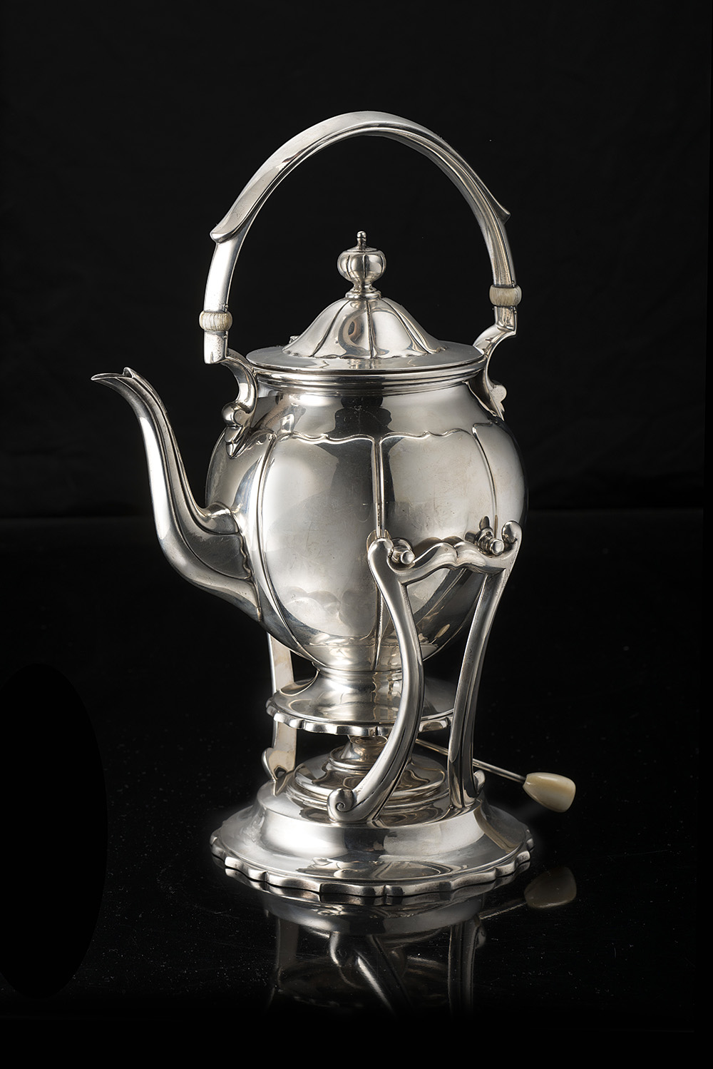 Samovar in argento a corpo liscio, ansa decorata a riccioli. Base porta...