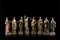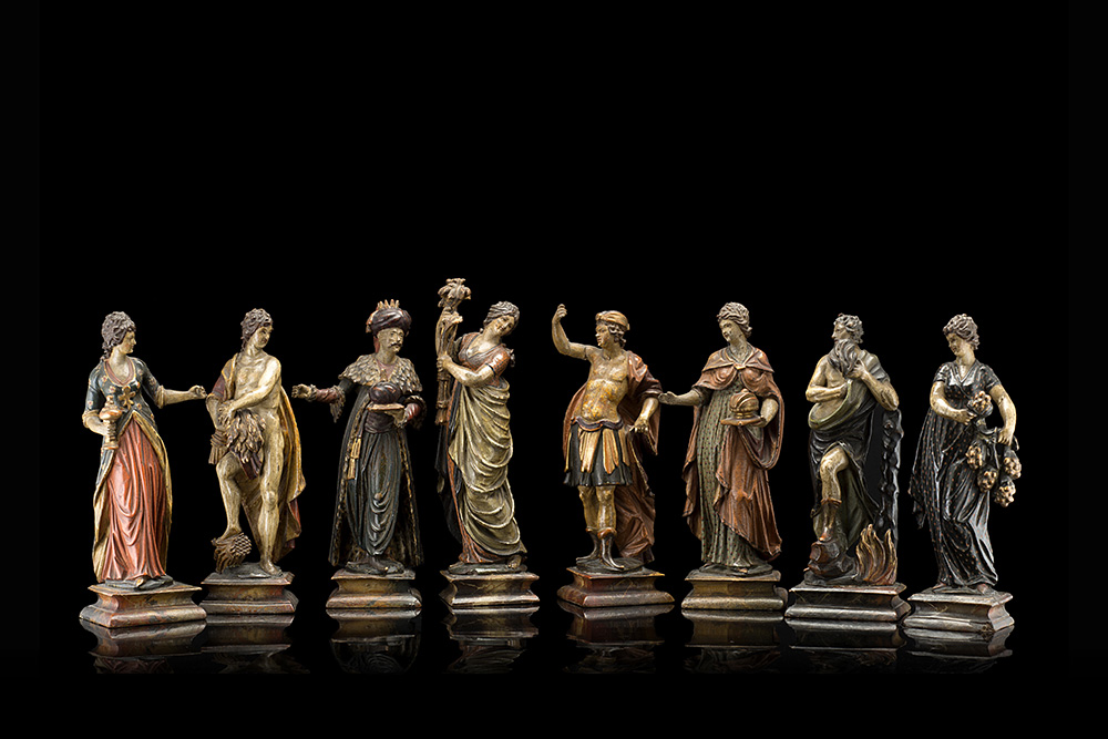 18th-century Veneto sculptor. A group of eight polychrome wooden figures representing the allegories of the four seasons, two Ladies, a Magus and a man (h. max cm 32) (defects and losses)