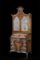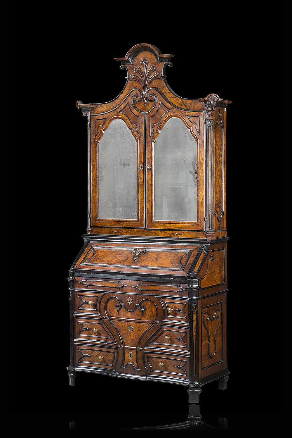 Trumeau lastronato in radica di noce, cartelle sagomate e profili in legno ebanizzato. Parte superiore a due ante a vetri, cimasa a timpano spezzato centrato da applicazioni in legno a rilievo. Parte inferiore di forma mossa a tre cassetti con calatoia celante cassettini e segreti. Lombardia, secolo XVIII (cm 108x243x52,5) (difetti e restauri)