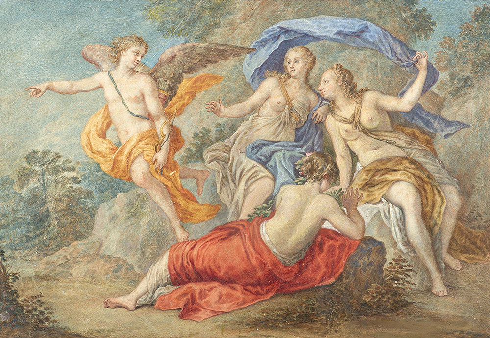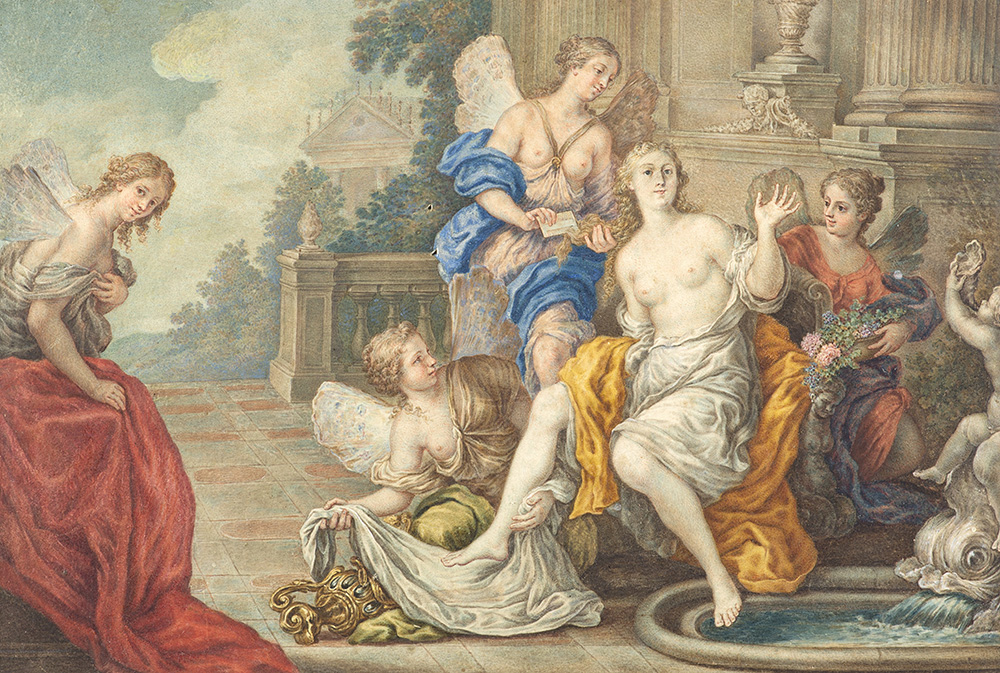 Maestro francese del secolo XVIIILa toeletta di VenereTempera su pergamena...