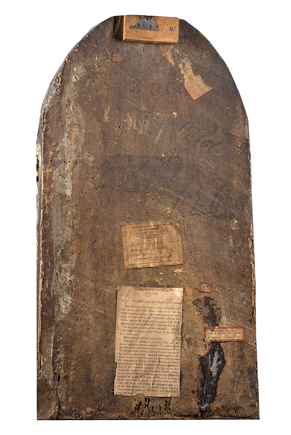 Al verso etichetta: "Loan Exhibition of Italian Primitives / In Aid of The American War Relief / November 1917 / LANDER: F. Kleinberg Galleries Inc. / ARTIST: Ambrogio di Baldese / CATALOGUE: no. 15 / F. KLEINBERG GALLERIES INC. / New York"