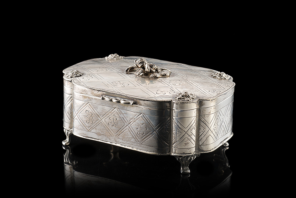 Scatola di forma mossa in argento con corpo decorato a motivi concatenati e...