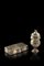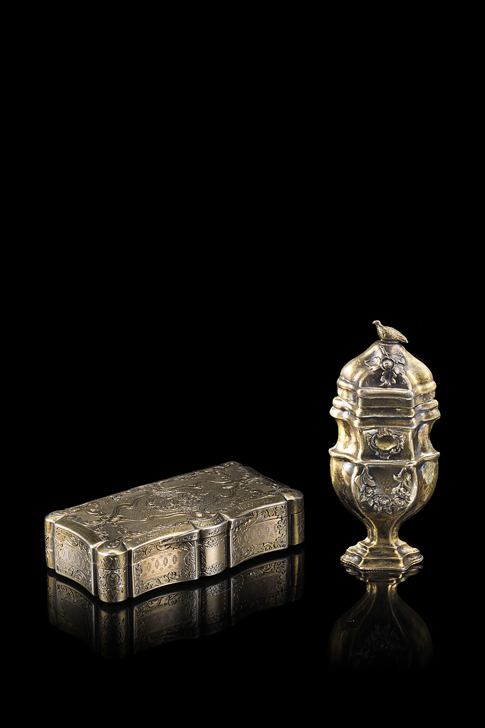 Lotto composto da due tabacchiere in argento dorato, una cesellata a fiori e volute con cifre e iscrizione, recante marchi di Anan, secolo XIX, l'altra sbalzata a mazzi fioriti con coperchio sormontato da quaglia a tutto tondo, punzoni non decifrati, secolo XIX (g tot. 144 ca.) (difetti)