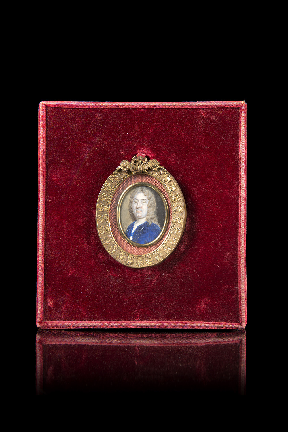Scuola della fine del secolo XVIII "Ritratto di gentiluomo" miniatura ovale su avorio (cm 4x3) In cornice in bronzo con cimasa con faretre (difetti)