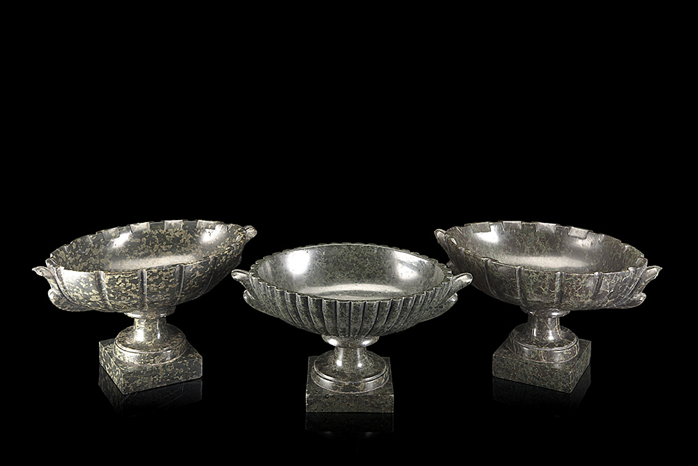 Lotto composto da due alzate biansate in marmo verde Alpi con corpo costolato e fusto tornito poggiante su base sagomata, unite a un'altra di simil decoro (h. max cm 14) (restauri)