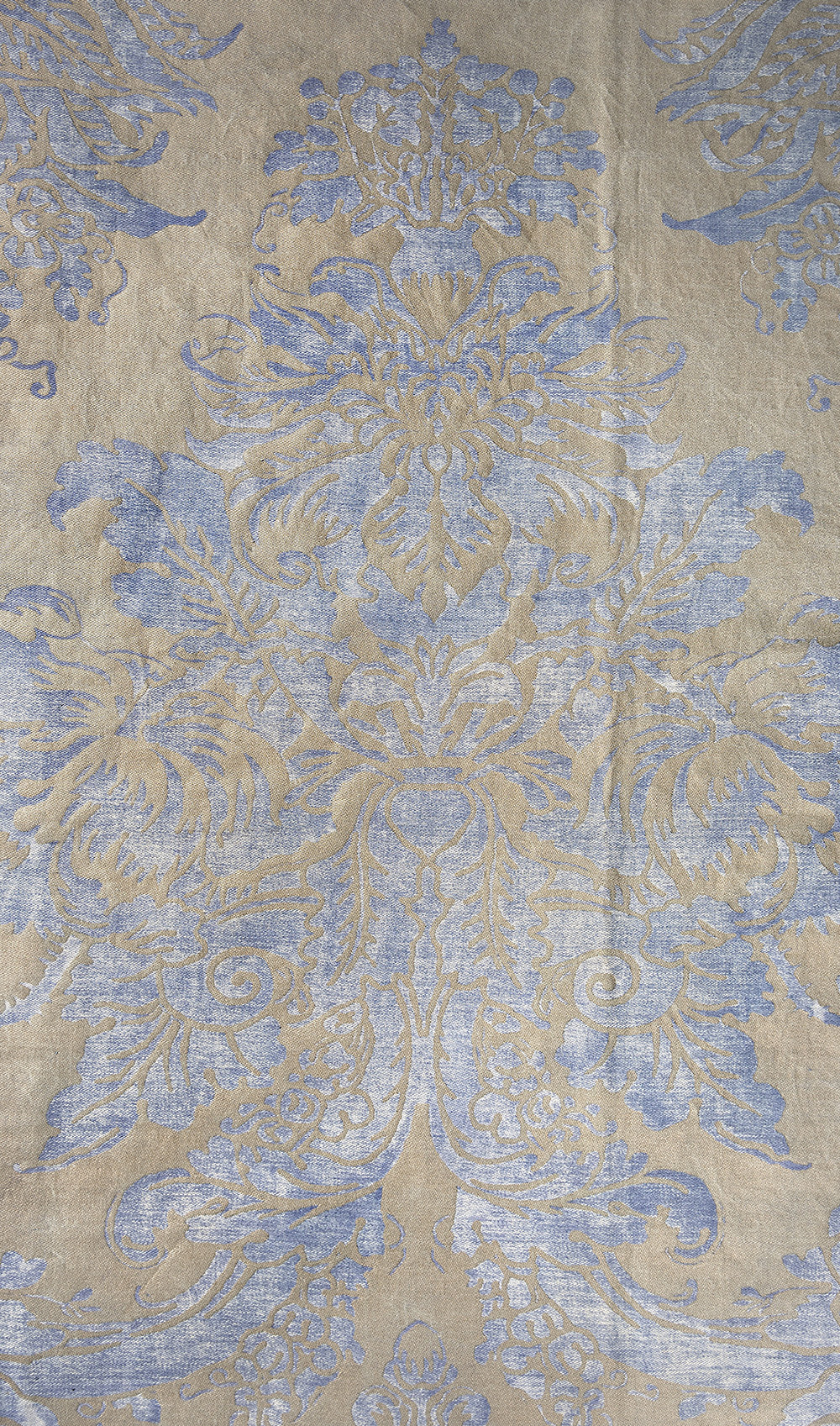 Gruppo di tre tessuti da arredamento in cotone stampato tramite collante, in seguito spolverato di polvere d'argento su fondo azzurro carta da zucchero melange. Probabile manifattura Mariano Fortuny, Venezia (cm 317x118; cm 309x129; cm 322x54) (difetti)