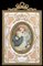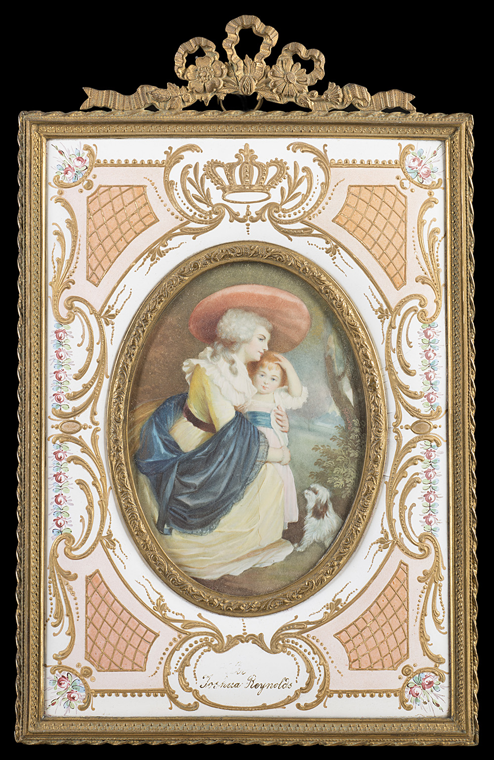 Scuola francese, secolo XIX " Donna con cappello e cane" miniatura ovale su avorio (cm 12x8) In cornice in bronzo con placca smaltata a fondo bianco decorata in policromia a fiori e rialzi in oro