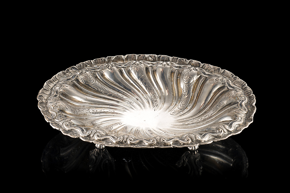Centrotavola in argento sbalzato a foglie e inciso a fiori. Italia, inizio secolo XX, titolo 800 (lung. cm 30) (g 430 ca.) (difetti e mancanza di una vite alla base)