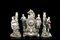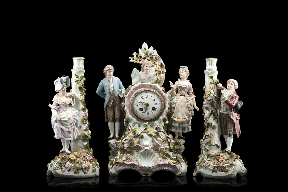 Manifattura tedesca, fine secolo XIX. Trittico in porcellana policroma composto da pendola e candelieri decorati a volute, valve di conchiglia e rami fioriti in rilievo, sormontati da figure di gentiluomini e gentildonne a tutto tondo. Quadrante in smalti a numeri arabi e romani, movimento con carica settimanale suoneria delle ore e delle mezze su campanello (h. max cm 43) (difetti)
