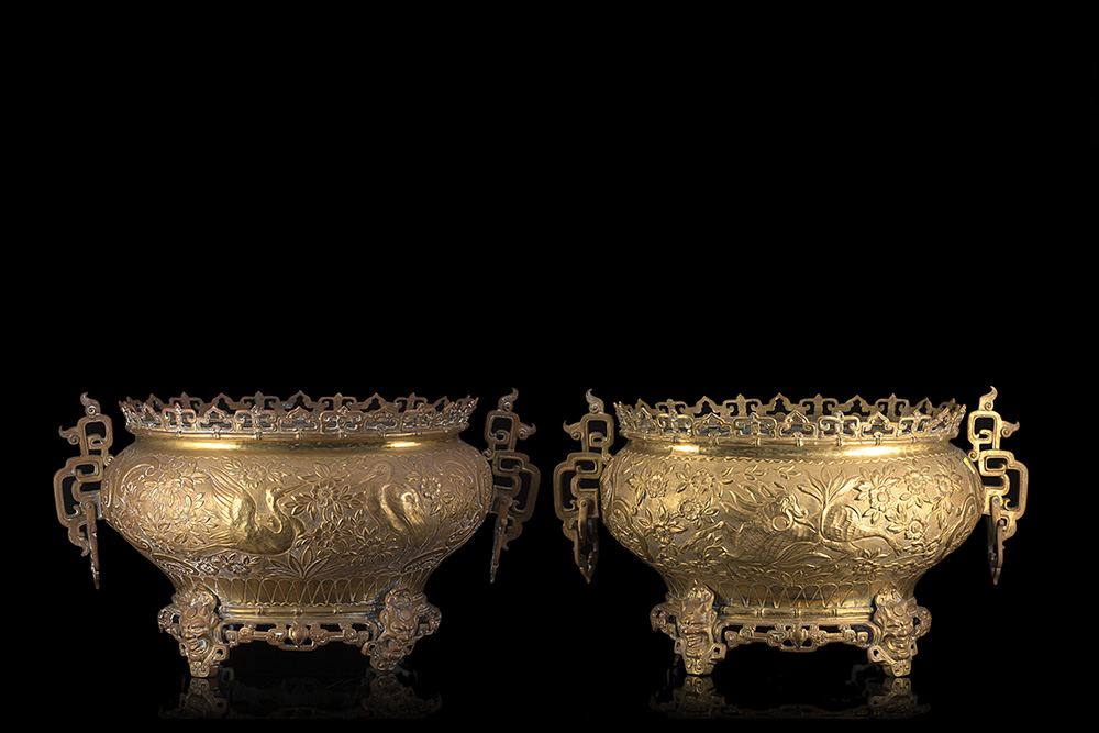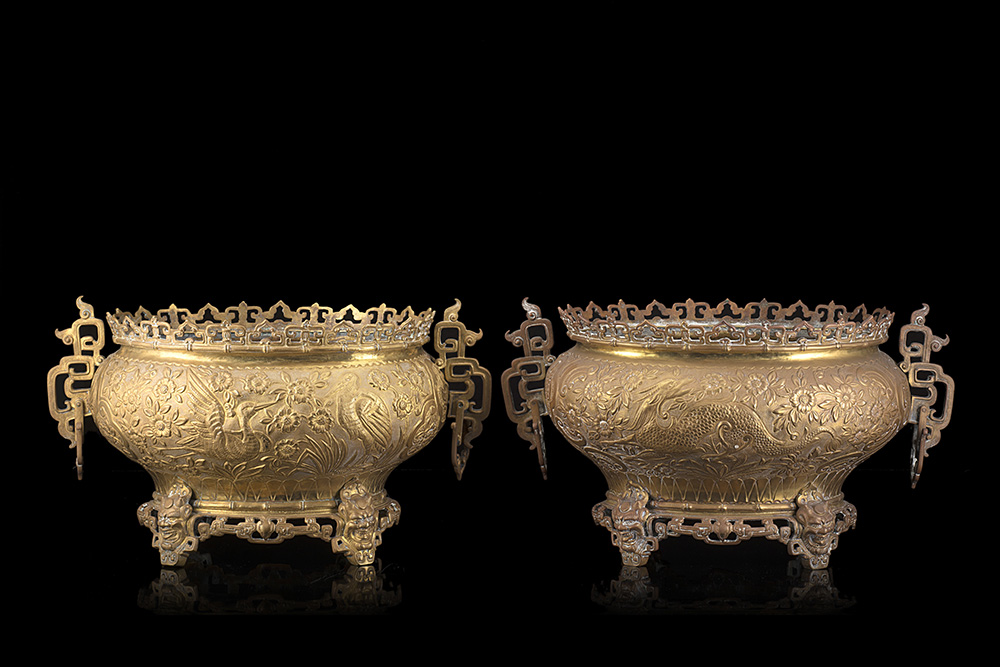 Coppia di fioriere biansate in rame e bronzo dorato con corpo sbalzato a dragoni e aironi tra elementi floreali. Ghiera, anse e base traforata a elementi stilizzati. Piedi decorati a mascheroni (cm 48x26x26) Francia, fine secolo XIX (difetti)