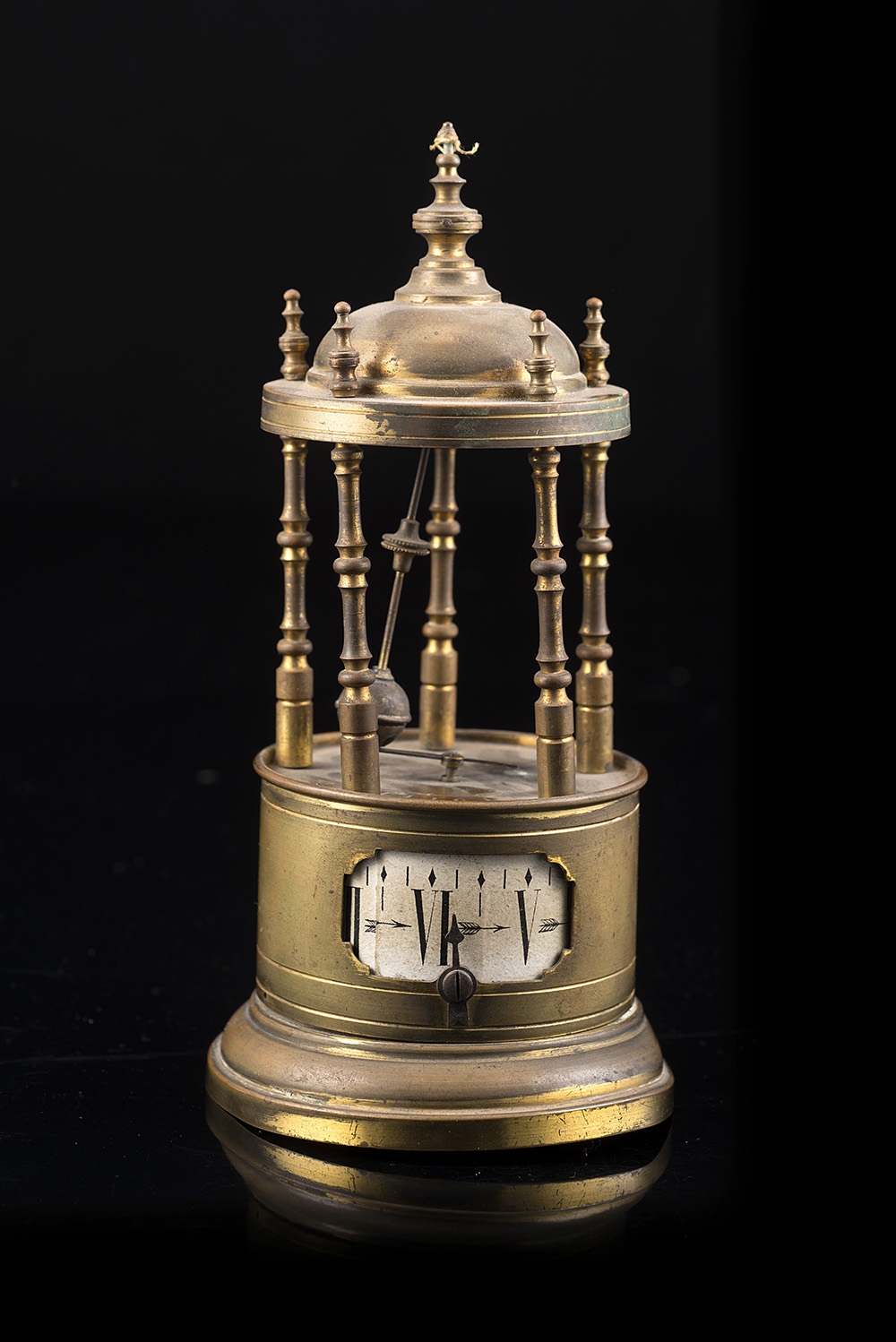Orologio da tavolo francese costruito da Eugene Farcot (1850 1896) del tipo "misterioso" a forma di tempio in ottone.