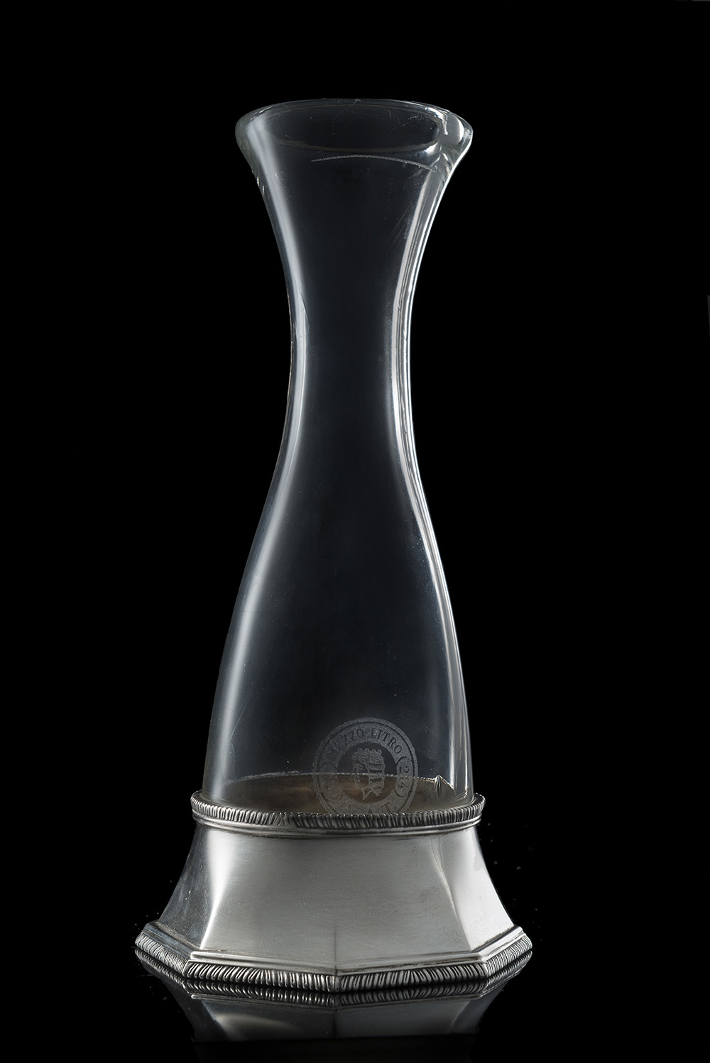 Bottiglia per quarto di vino con base in argento ottagonale con bordi cordonati. Faraone, Milano (h. cm 25)