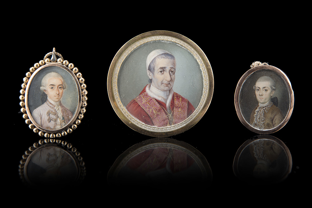 Gruppo di tre miniature del secolo XIX raffiguranti gentiluomini e Papa...