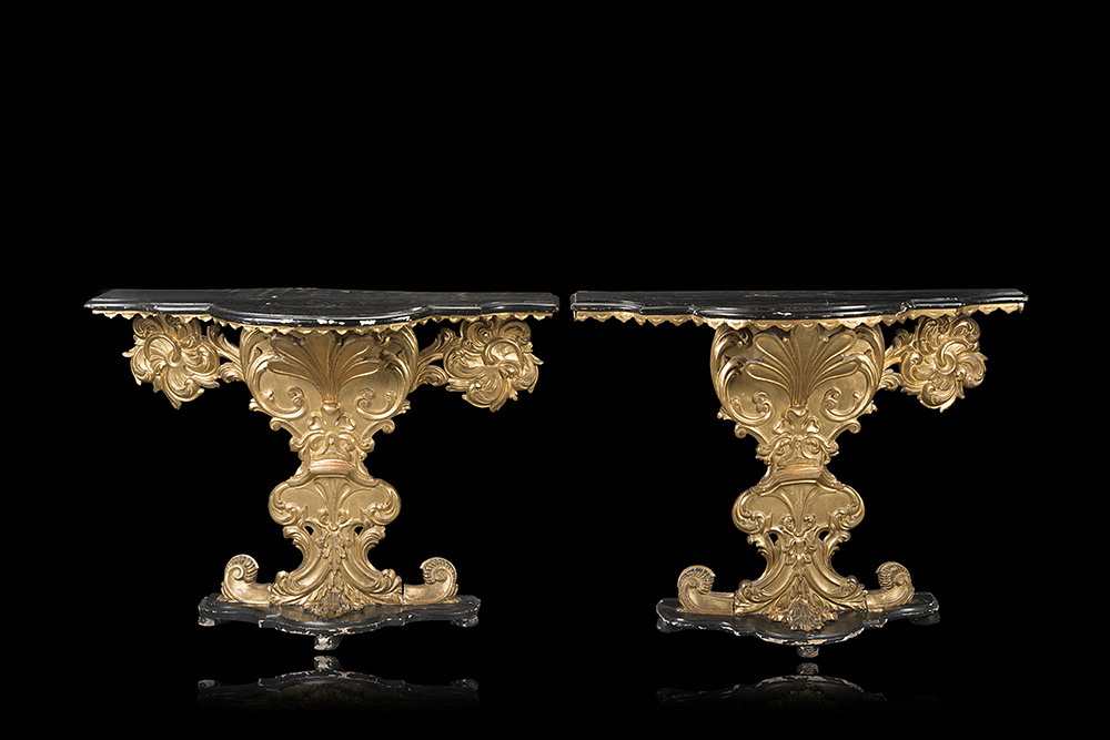 Coppia di consolles di forma sagomata con piani in legno ebanizzato. Montanti in legno intagliato e dorato a volute fogliate. Lombardia, secolo XVIII (cm 110x86x42) (mancanze)