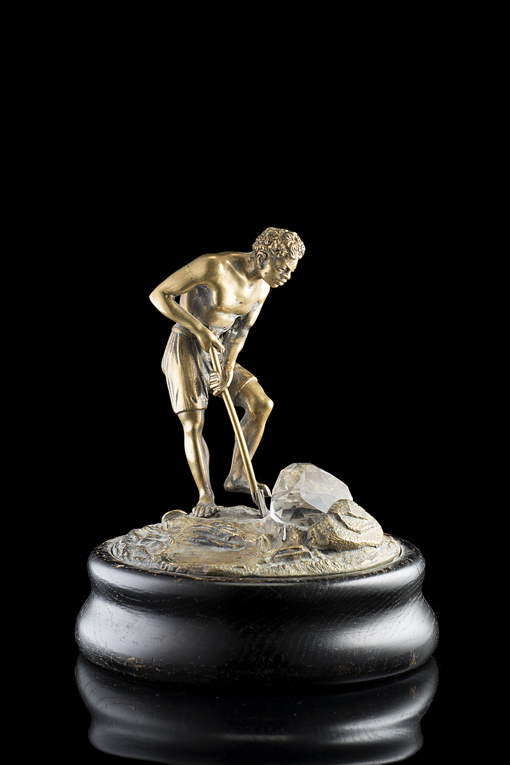 Scultore del secolo XIX "Schiavo moro" gruppo in bronzo dorato (h.cm 20) con diamante in vetro. Poggiante su base in legno tornito (mancanze)