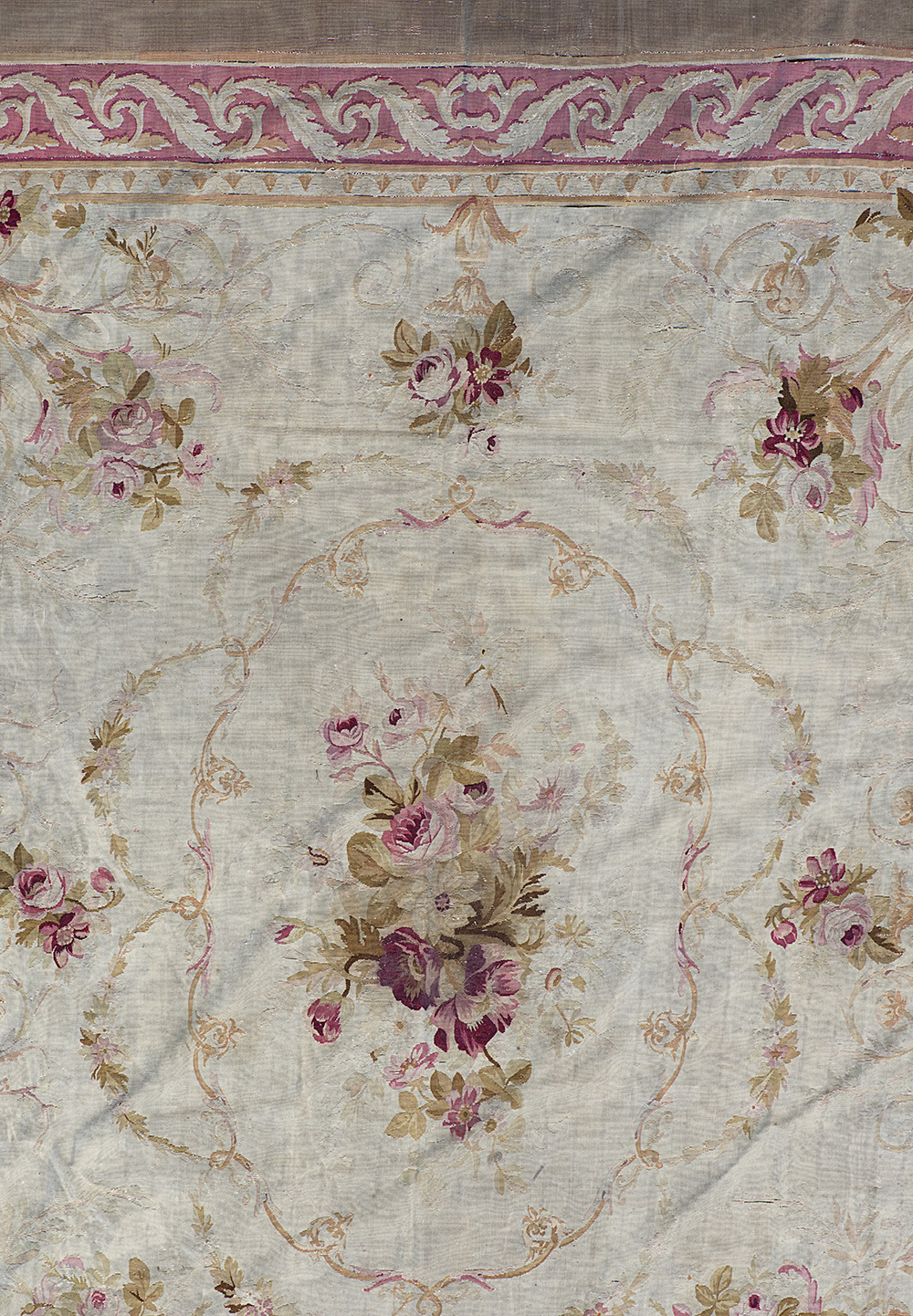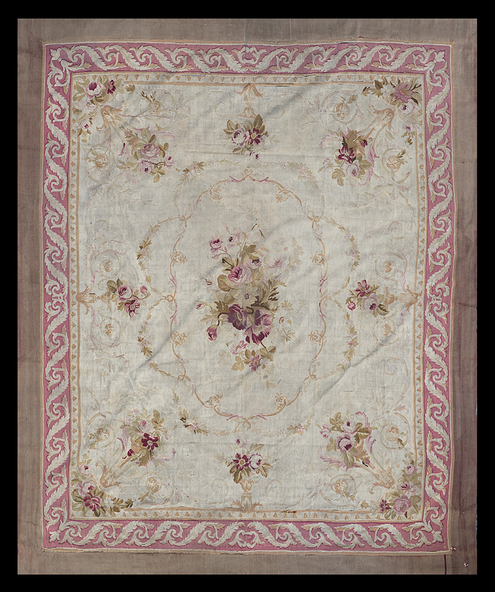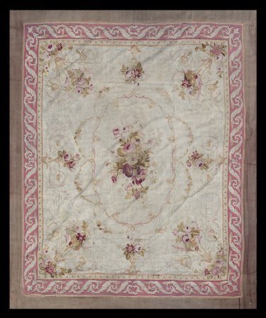 Tappeto Aubusson. Francia, secolo XIX. Decoro con medaglione floreale su fondo beige, bordura con foglie d'acanto a meandro su fondo rosa (cm 237x268) (difetti, strappi e leggere macchie)