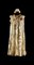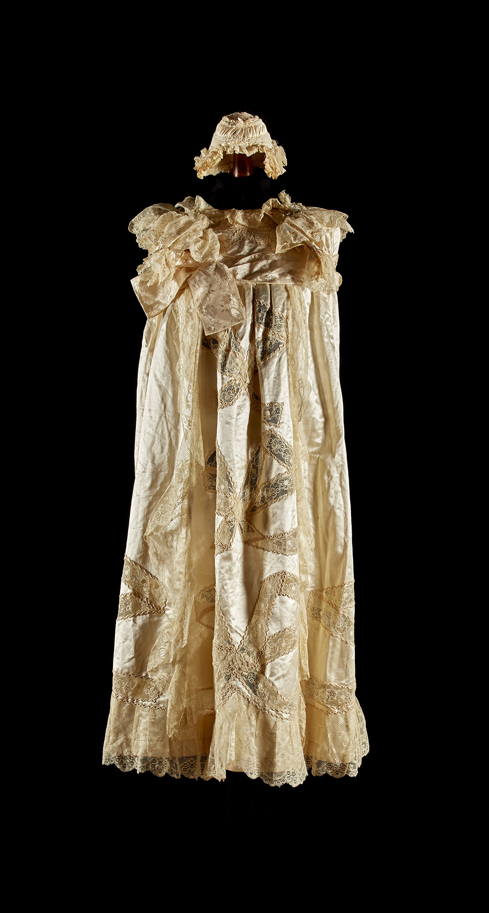 Parure da battesimo in raso di seta color crema decorata con pizzo a telaio e nastri di seta moiré con rami fioriti. Composto da vestina e cuffietta (difetti e macchie)
