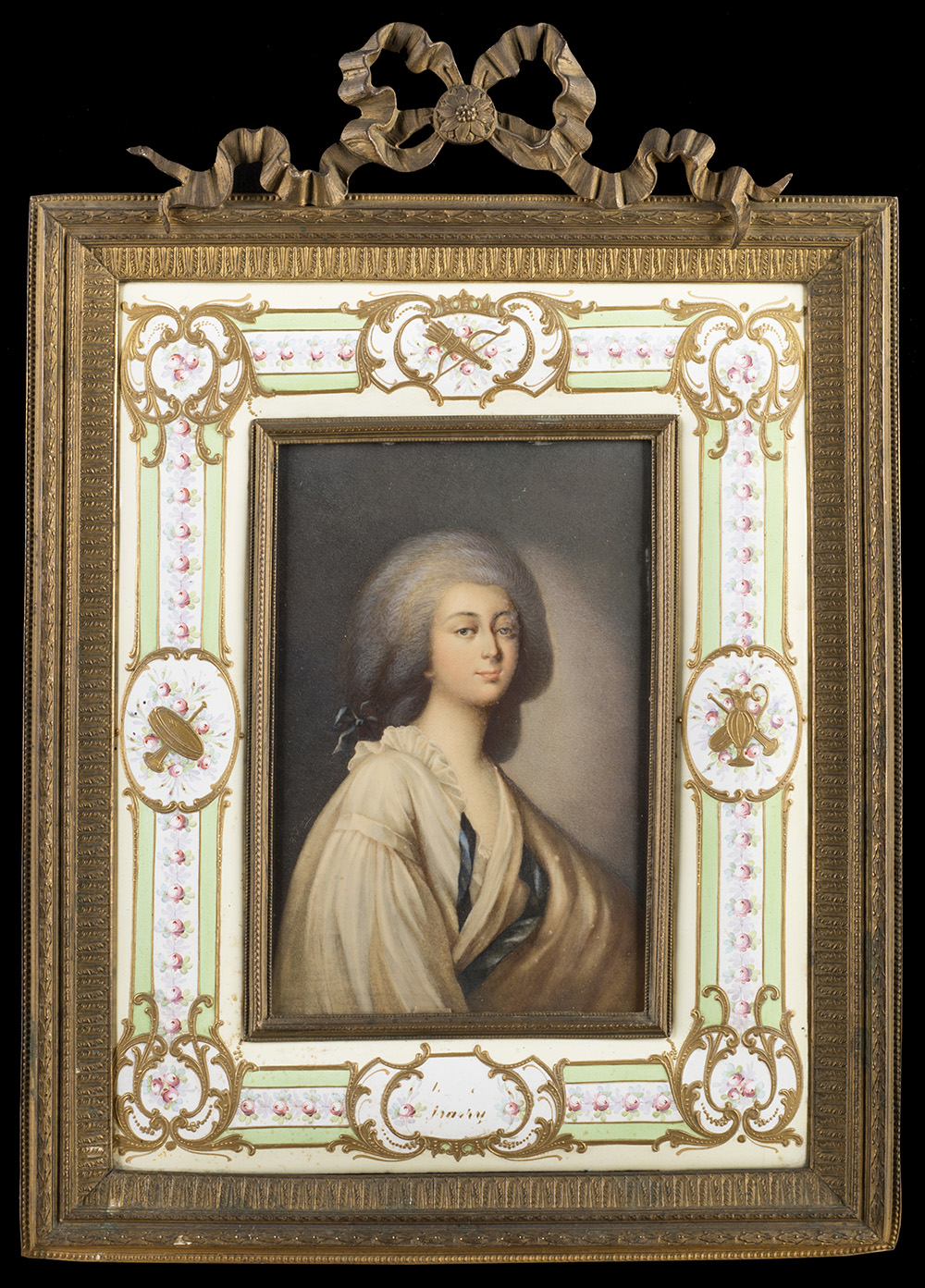 19th-century French school "Portrait of a Lady" miniature on ivory (cm 18x11) In a bronze frame with enamelled polychrome plaque