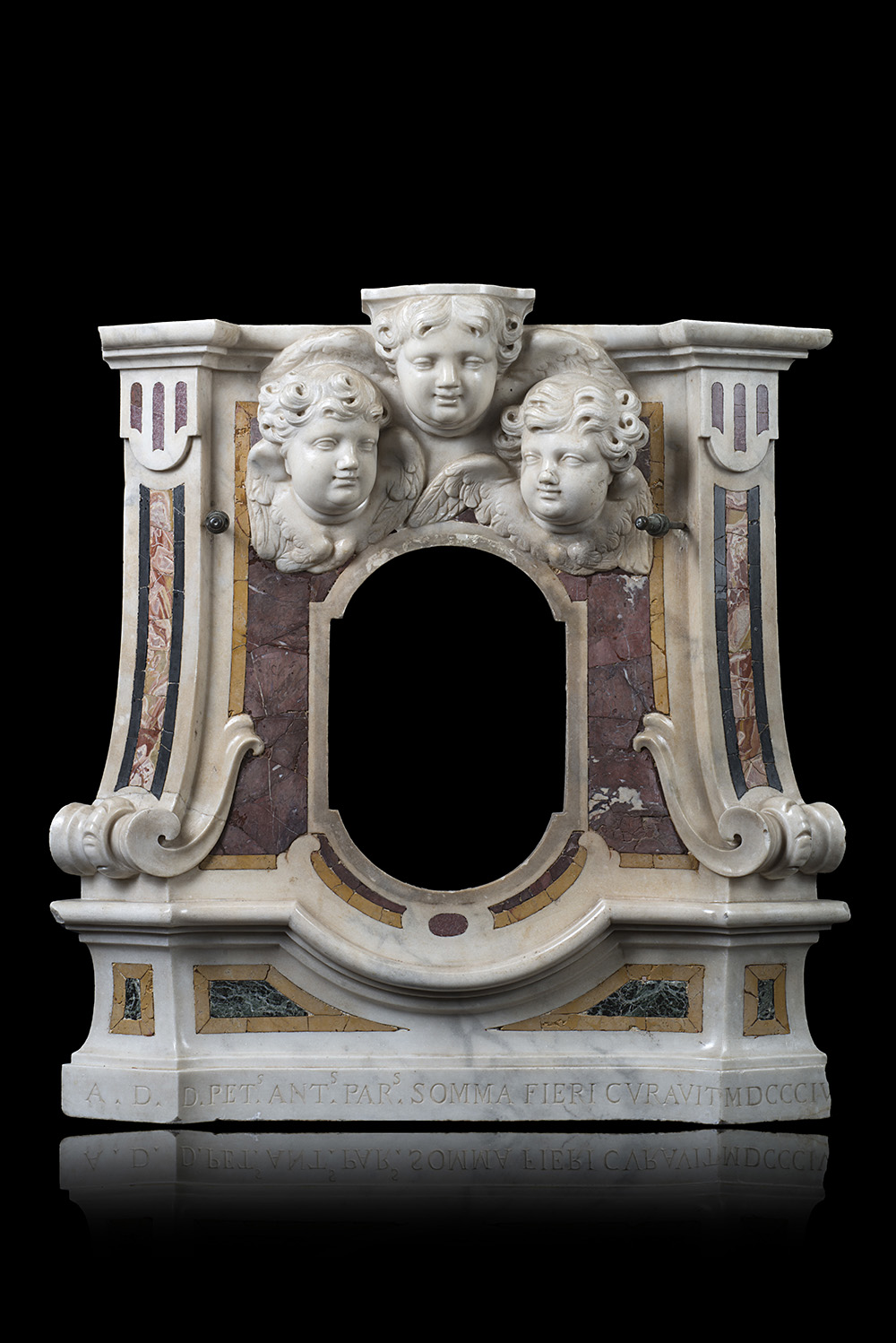 A marble inlaid and carved tabernacle. Inscribed A.D. D. PET. ANT. PAR. SOMMA FIERI CURAVIT MDCCCIV (cm 66x68x13) (losses)