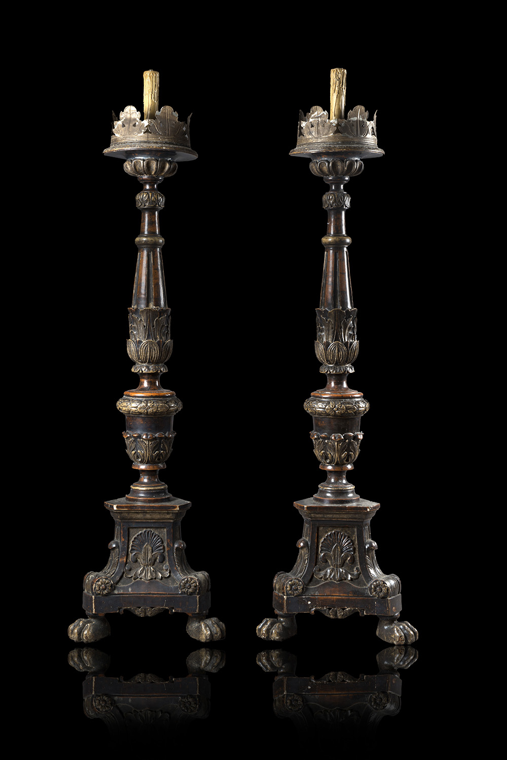 Coppia di portaceri in legno intagliato, argentato e parzialmente laccato a volute e foglie, colonna scanalata poggiante su base tripode scolpita a mitria dorata e gigli, piedi a zampa ferina. Secolo XVII (h. cm 174) (difetti, montati a luce elettrica in epoca posteriore)