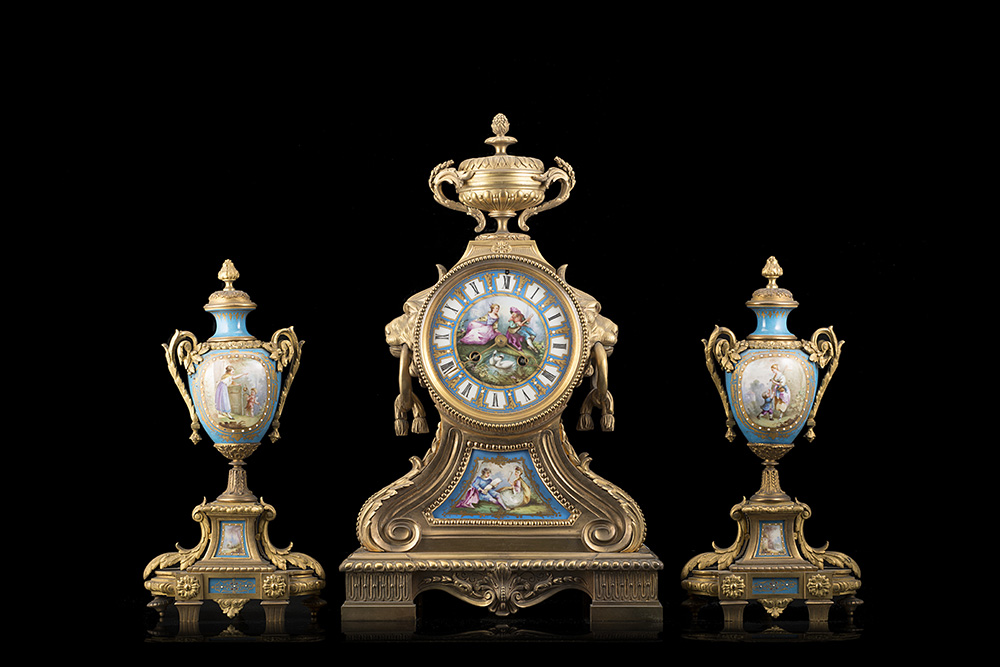 Trittico da camino in bronzo e porcellana azzurra decorato in policromia a scene galanti composto da orologio e due vasi a candeliere. L’orologio presenta un movimento con carica settimanale suoneria delle ore e delle mezze con partitora su campanello, quadrante in smalto con numeri romani decorato ad imitazione dei cartouches. Movimento n. ND 1503 Francia, seconda metà secolo XIX