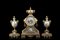 Bronze and porcelain three-piece garniture de cheminée comprising a pair of candelabras and a mantel clock . The clock with weekly wind movement, strike on bell and enamelled dial with Roman numerals. Movement n. ND 1503. France, second half 18th century