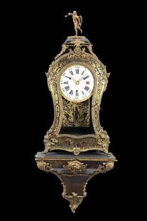 A Boule style cartel clock with veneered console, neuchâteloise-type dial and movement datable to the second half of the XVIII century. The case datable to the early 19th century. Three strike movement on hours and quarters with repetition of alarm.