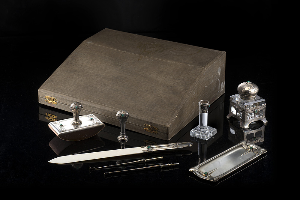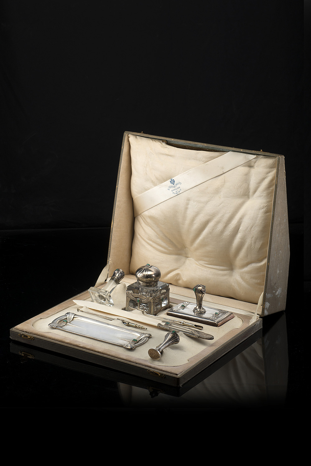 Set da scrivania in argento a decoro Liberty con cabochon in pietra dura composto da due sigilli, vaschetta porta inchiostro, tampone, matita, pennino, tagliacarte e vassoietto. In custodia sagomata e impressa in oro. Terracini e figli, Torino, 1880 ca. (lievi difetti e mancanze)