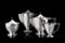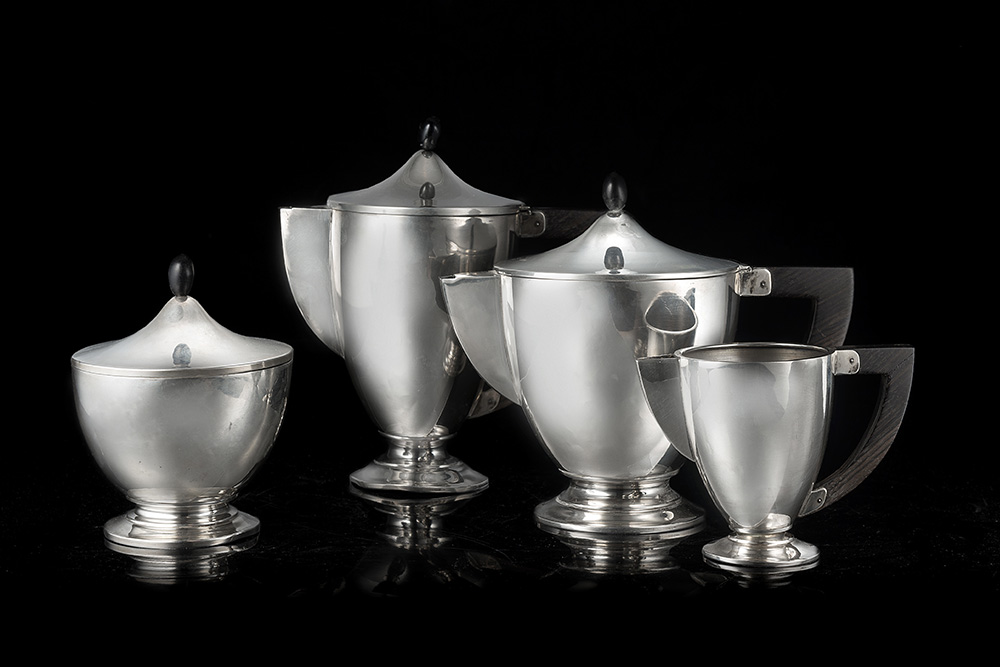 A silver tea and coffee set composed of a teapot, a coffeepot, a milk jug and a sugar bowl. 1940 ca. (g gross 1550 ca.) (minor defects)