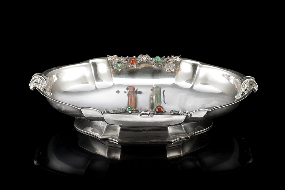 Centrotavola in argento con anse a rilievo a volute fogliate e bordi decorati a rami con frutti con cabochon in pietra dura e malachite. Italia, 1940 ca., punzoni non decifrati (l. cm 43) (g lordi 1160 ca.) (lievi difetti)