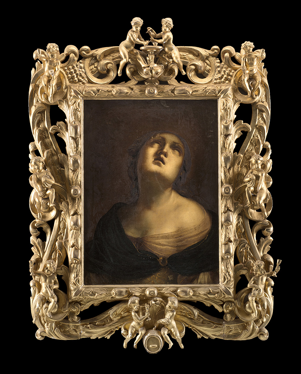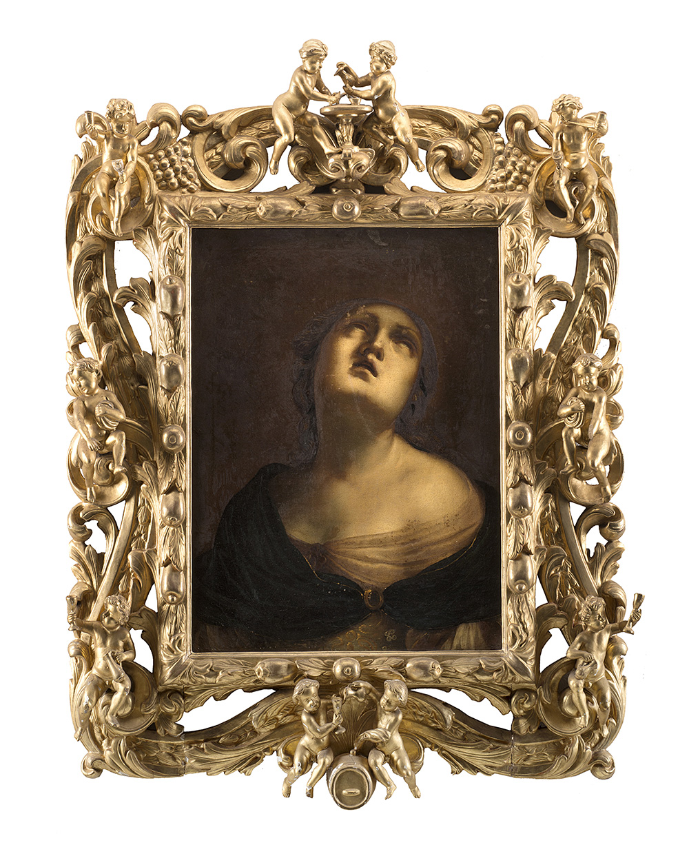 In a fine and gilt-wood coeval frame carved with fruit, flowers and all-round putti (defects and restorations)
