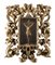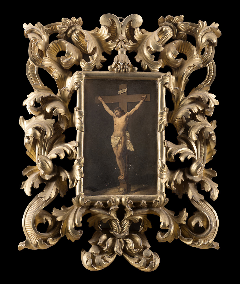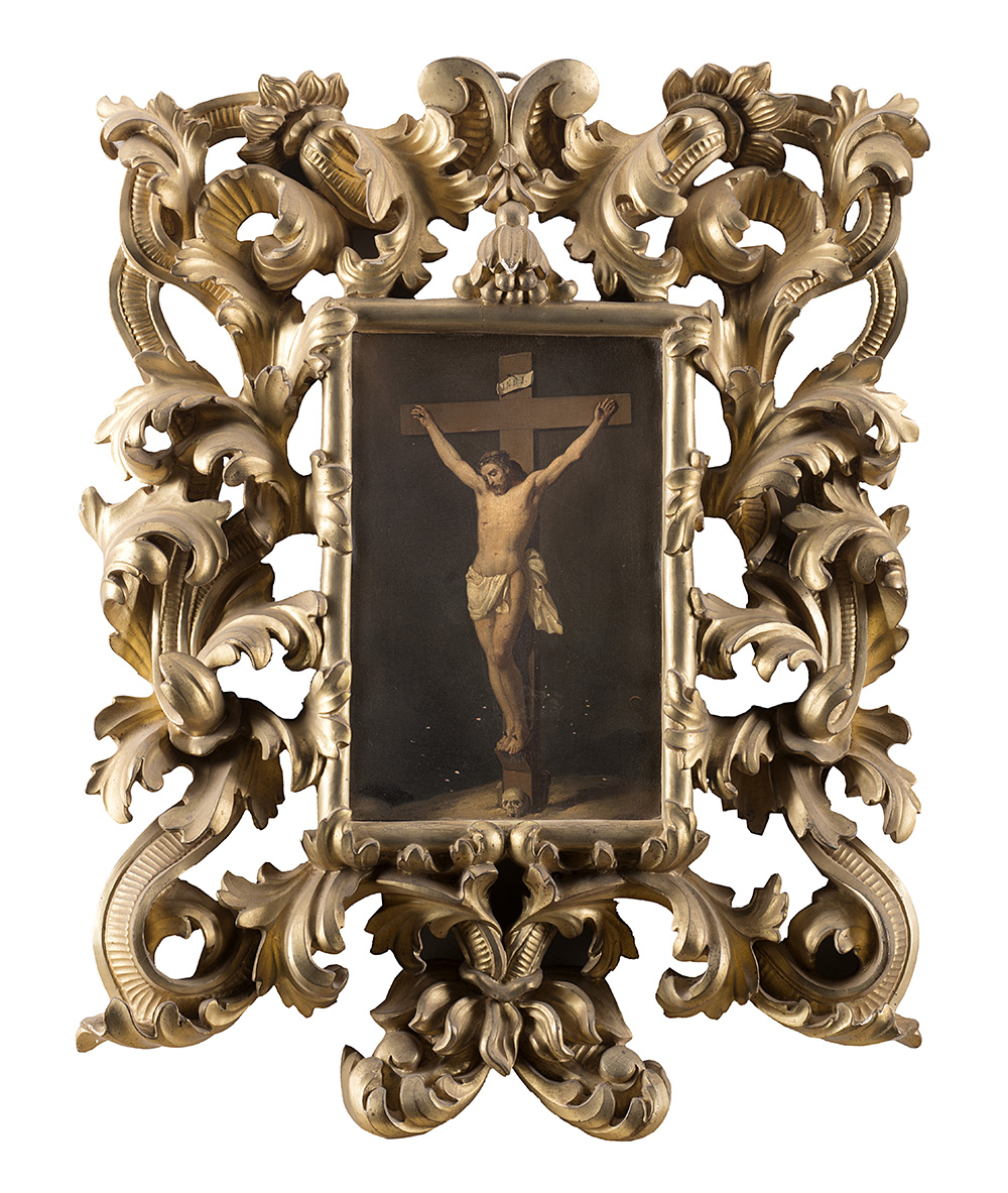 In cornice in legno intagliato, traforato e dorato a volute e fiori (lievi difetti)