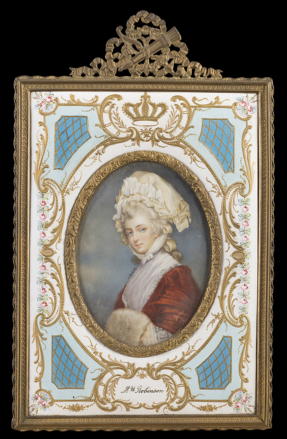 Scuola francese, secolo XIX " Mrs Robinson" miniatura ovale su avorio (cm 12x8) In cornice in bronzo con placca in smalto a fondo bianco decorata in policromia a fiori, riserve e rialzi in oro